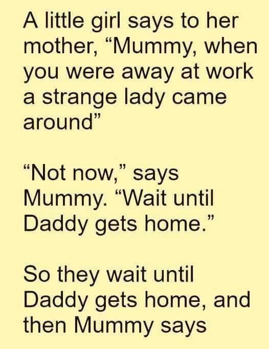 A little girl says to her mother: “Mummy, when you were away at work a strange lady came around”… “Not […]