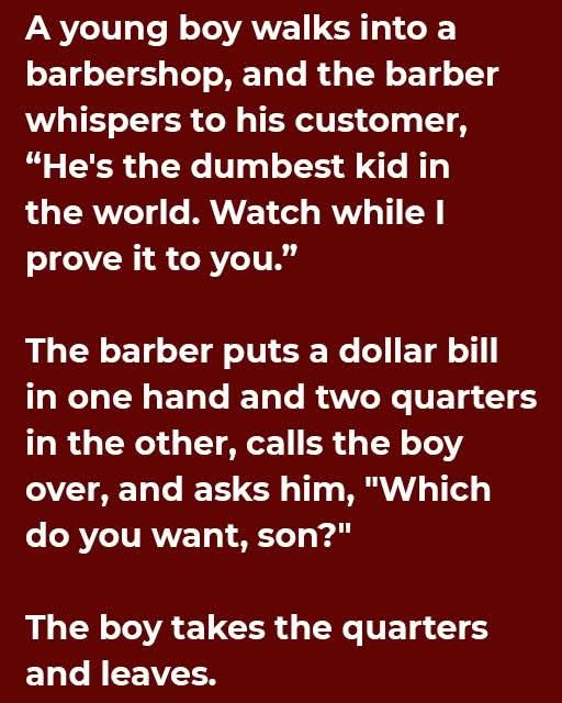 young boy walks into a barbershop, and the barber whispers to his customer, “He’s the dumbest kid in the world.