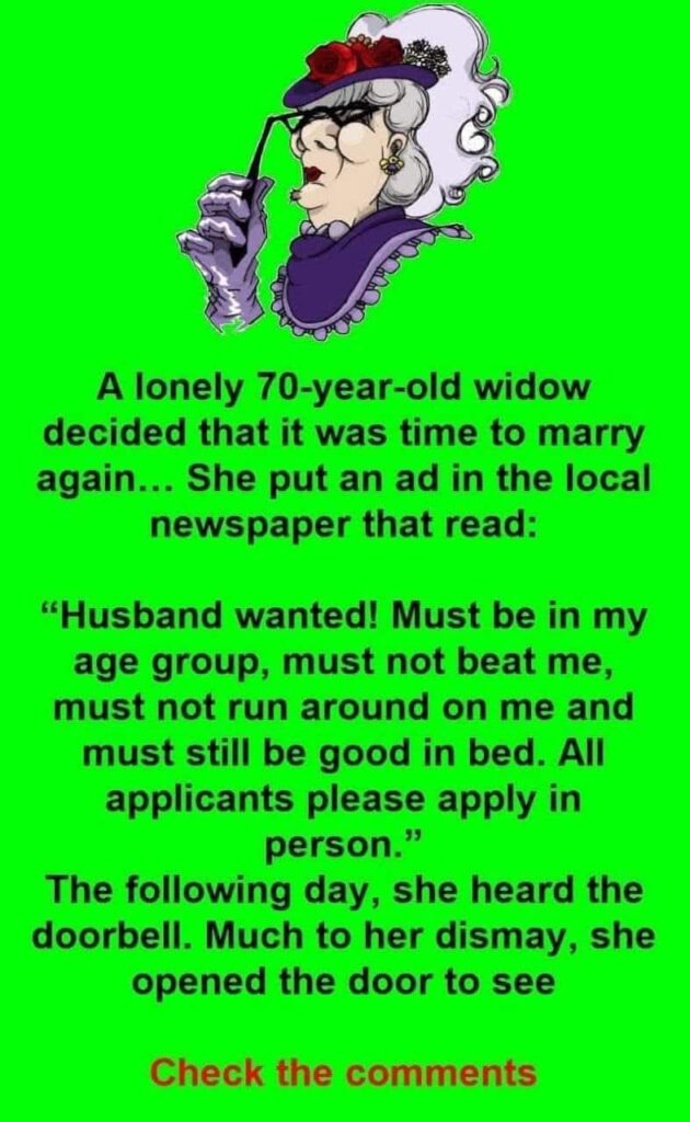 “Husband wanted! Must be in my age group, must not beat me, must not run around on me and must still be good in bed. All applicants please apply in person.”
