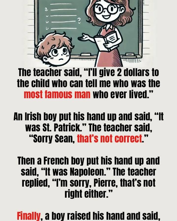 The teacher said, “I’ll give 2 dollars to the child who can tell me who was the most famous man