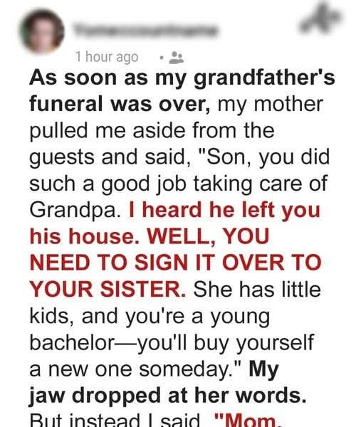 As soon as my grandfather’s funeral was over, my mother pulled me aside from the guests and said, “Son, you did such a good job taking care of Grandpa. I heard he left you his house. WELL, YOU NEED TO SIGN IT OVER TO YOUR SISTER. She has little kids, and you’re a young bachelor—you’ll buy yourself a new one someday.”