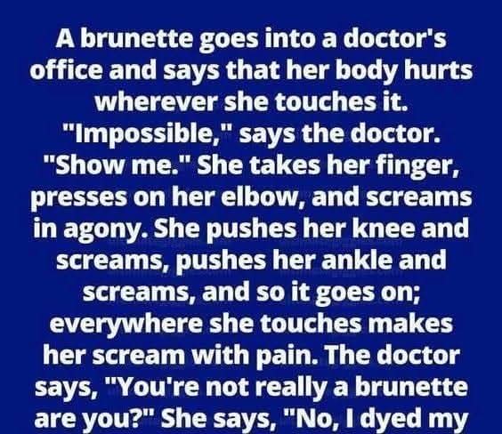 A brunette goes into a doctor’s office and says that her body hurts wherever she touches it.
