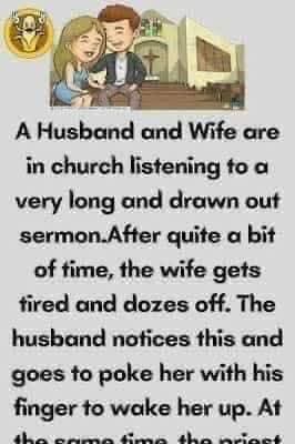 A husband and wife are at a church, listening to a lengthy ceremony. The wife can’t help herself but fall asleep. Her husband notices this and tries to wake her up by poking her with his finger.