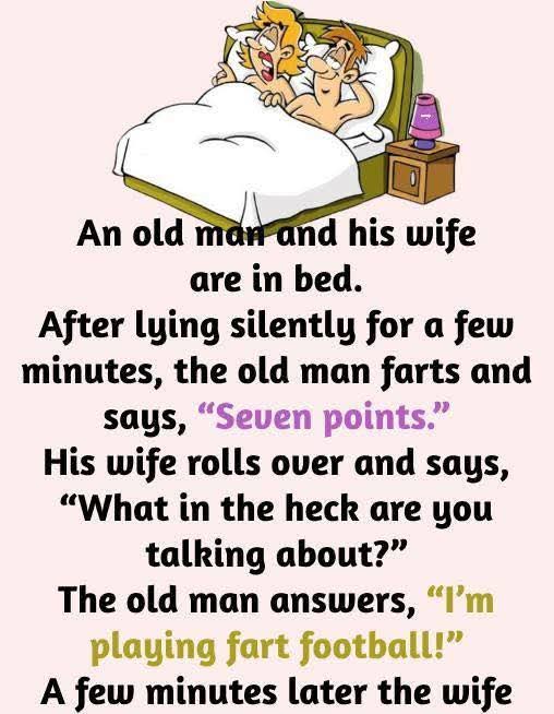 After about five minutes the old man farts again and says, “Touchdown! I’m winning 14 to 7!”