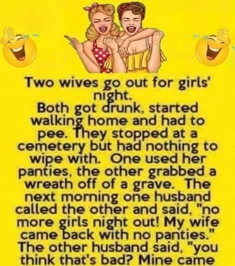 Two wives go out for girls’ night. Mine came back with a…”- LOL “Two wives go out for girls’ night.Both