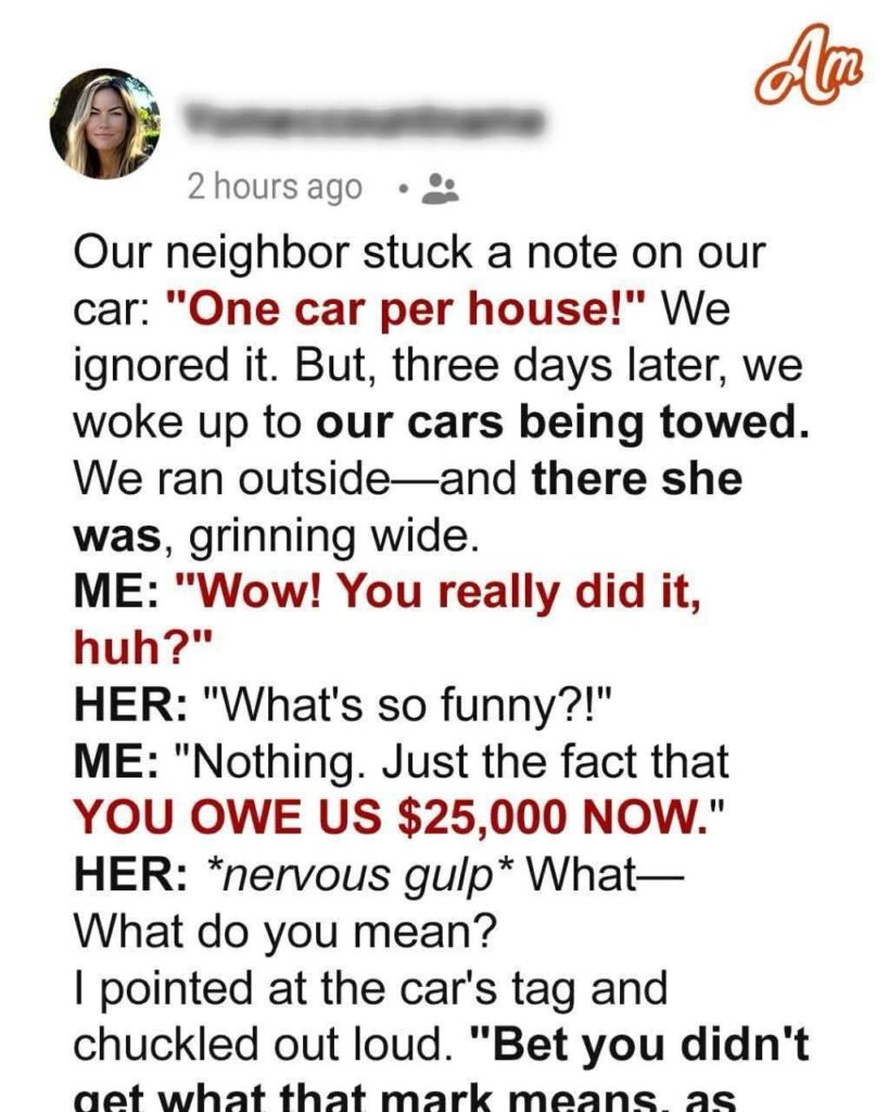 She smiled as our cars were hauled away, convinced she had won some neighborhood battle. But by the next morning,