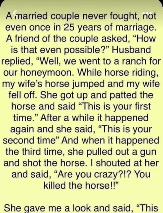 “A married couple never fought, not even once in 25 years of marriage. A friend of the couple asked, ‘How