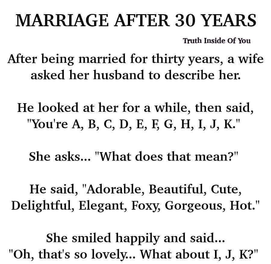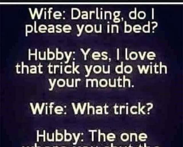 Wife: My dear, do I satisfy you in our intimate moments? Husband: Indeed, I appreciate that particular gesture you per.form