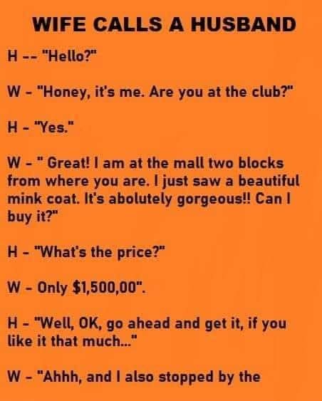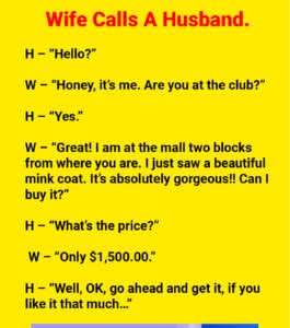 H – “Hello?” W – “Honey, it’s me. Are you at the club?” H – “Yes.” W – “Great! I