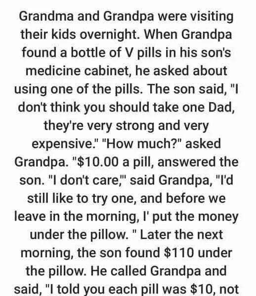 Grandma and Grandpa were visiting their kids overnight . When Grandpa found a bottle of Viagra in his son’s medicine