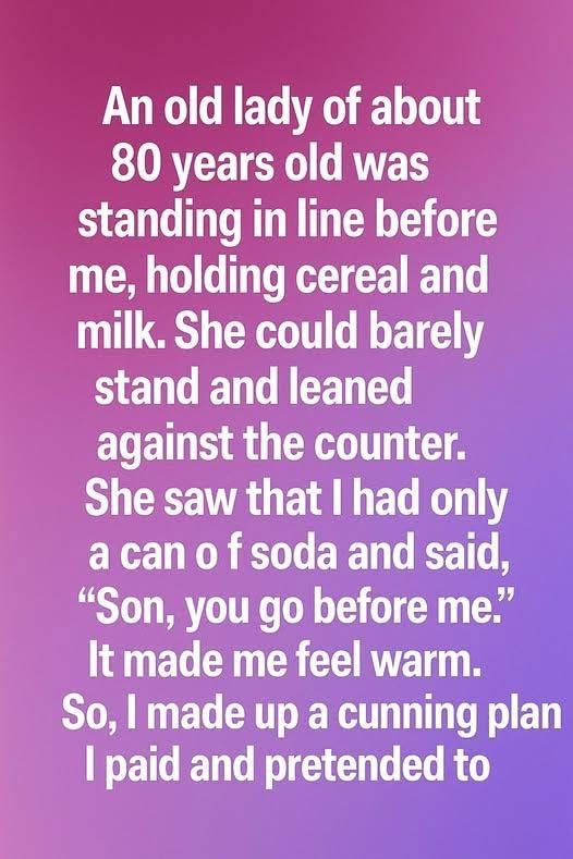 An old lady—she must have been close to eighty—stood in line ahead of me at the checkout, clutching a small