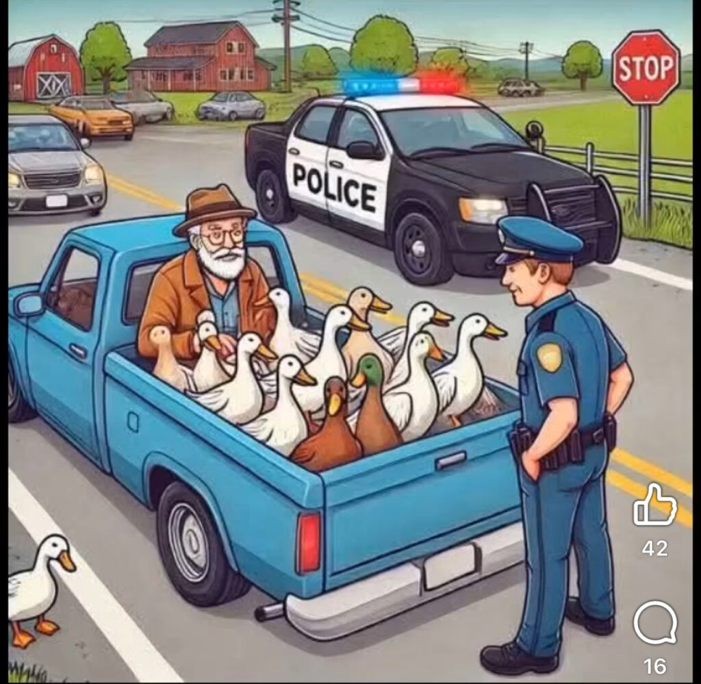 While patrolling downtown, a police officer stopped an elderly man driving a rusty pickup truck overflowing with ducks. Concerned, the