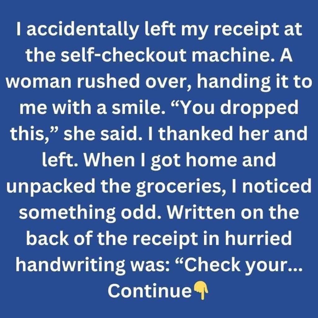 I accidentally left my receipt at the self-checkout machine. A woman rushed over, handing it to me with a smile.