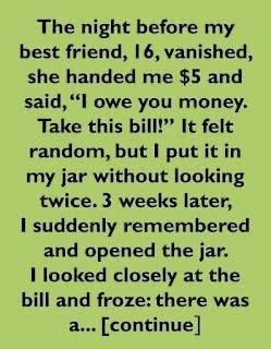 The night before my best friend disappeared, she pressed a crumpled $5 bill into my palm and said with a