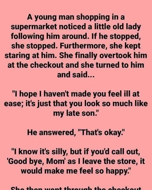 He moved down the aisles, he noticed something unusual. An elderly lady seemed to be following him. She wasn’t rushing