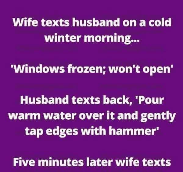 “Frozen Windows: A Hilarious Misunderstanding” Wife texts husband on a cold winter morning… “Windows frozen; won’t open.” Husband texts back,
