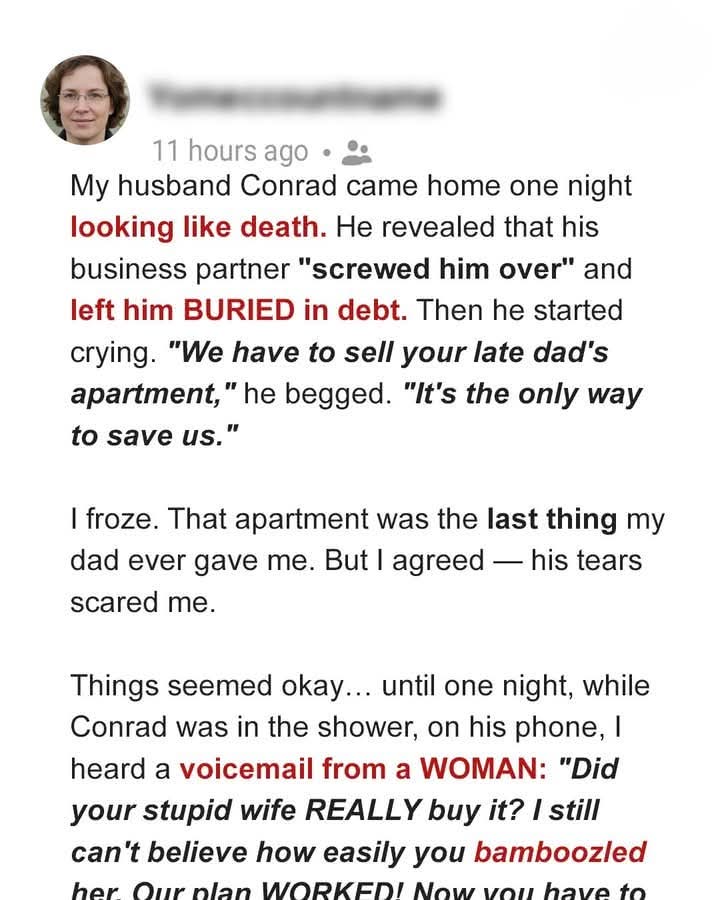 My Husband Made Me Sell My Apartment to Pay Off His ‘Business Debts’ After Being ‘Dumped’ by His Partner — But It All Turned Out to Be a Lie
