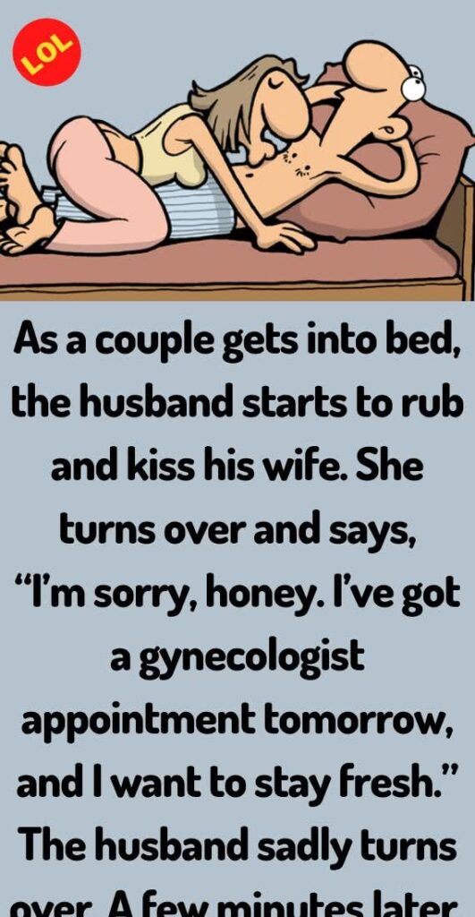 As a couple gets into bed, the husband starts to rub and kiss his wife. She turns over and says,