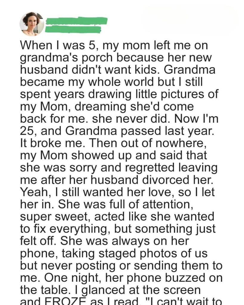 I was ten years old when my mother decided I was a burden. She had a new family, a picture-perfect