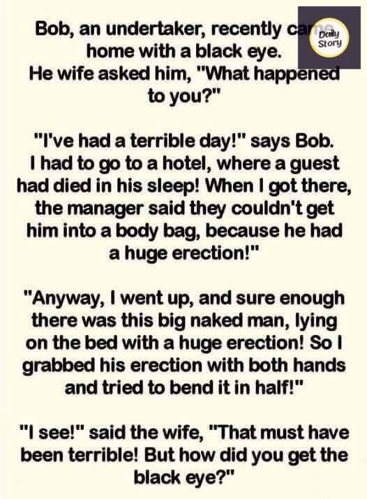 Bob, an undertaker, recently came home with a black eye.His wife asked him, “What happened to you?” “I’ve had a