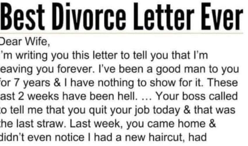 I’m writing you this letter to tell you that I’m leaving you forever. I’ve been a good man to you