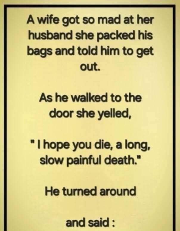 Wife wish to husband – JOKE OF THE DAY A wife got so mad at her husband she packed his