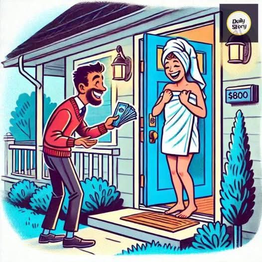 A woman was stepping out of the shower when the doorbell rang. Her husband was about to shower, so she