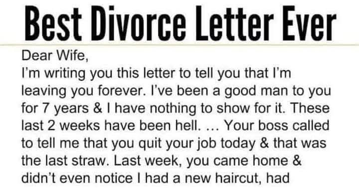 THE BEST DIVORCE LETTER EVER! Dear Wife, I’m writing you this letter to tell you that I’m leaving you forever.