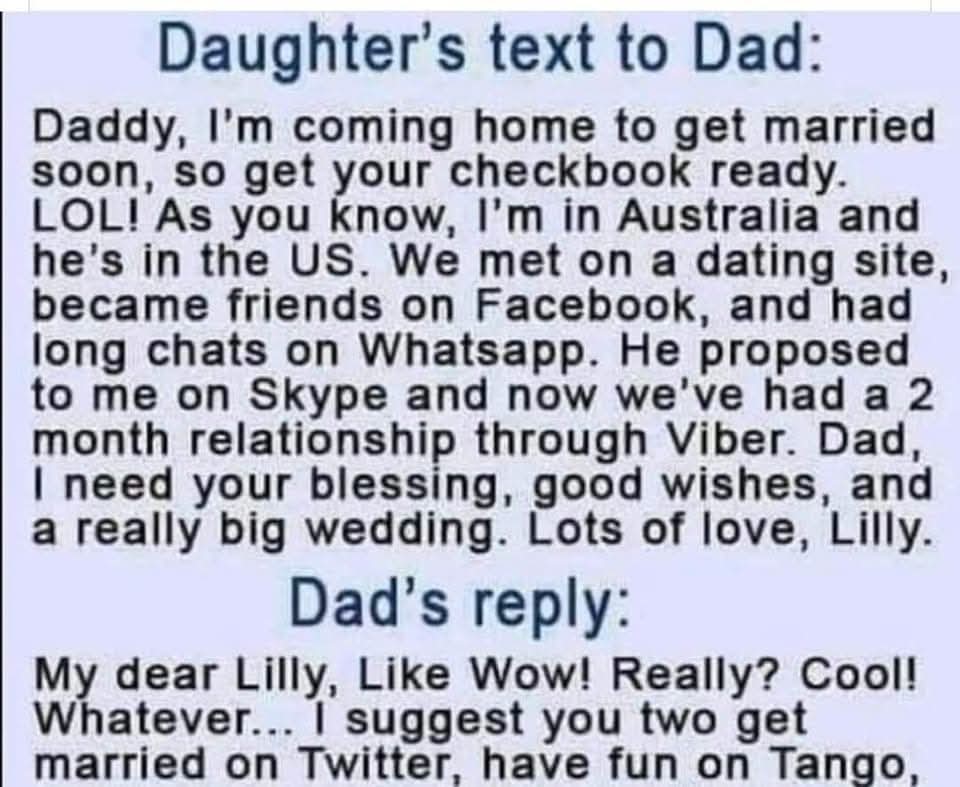 Imagine receiving a text message from your daughter, announcing that she’s getting married. Now imagine that the story of how