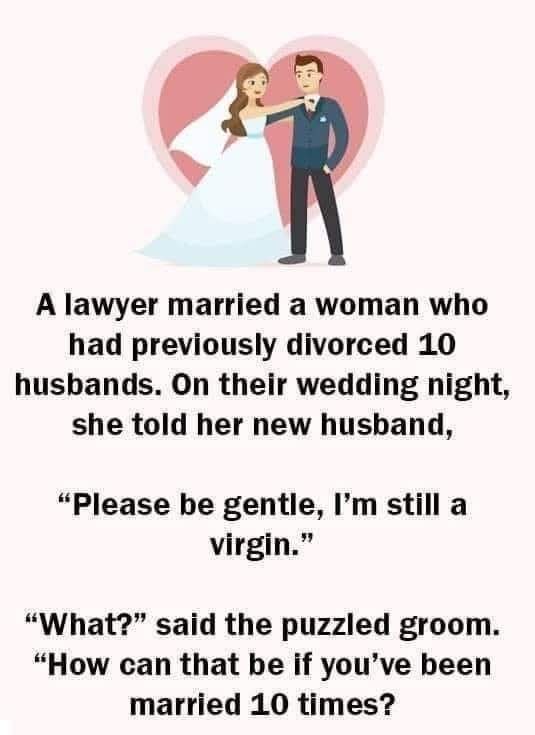 Husband #10 was a stamp collector. All he ever did was… God! I miss him! But now that I’ve married you, I’m really excited!” “Good,” said the new husband, “but, why?” “You’re a lawyer. This time I know I’m going to get screwed!”