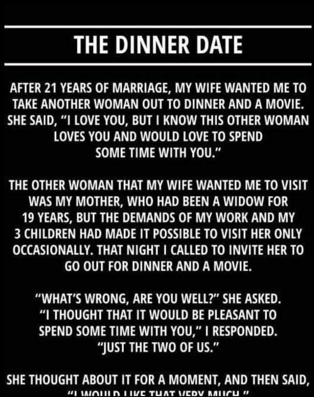 After 21 years of marriage, my wife wanted me to take another woman out to dinner and a movie. She said, “I love you, but I know this other woman loves you and would love to spend some time with you.” The other woman that my wife wanted me to visit was my mother, who had been a widow for 19 years, but the demands of my work and my 3 children had made it possible to visit her only occasionally. That night I called to invite her to go out for dinner and a movie. “What’s wrong, are you well?” she asked. “I thought that it would be pleasant to spend some time with you,” I responded. “Just the two of us.” She thought about it for a moment, and then said, “I would like that very much.”