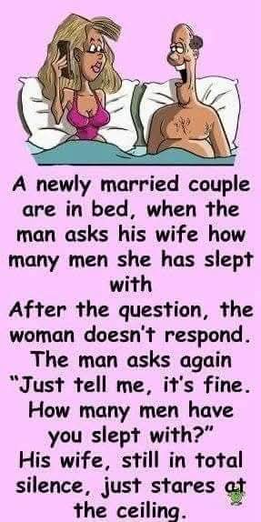 As they lay in bed, the husband asked his wife about the number of men she had been with. She remained silent, her eyes fixed on the ceiling. He asked again, assuring her it was okay, but still, she said nothing.