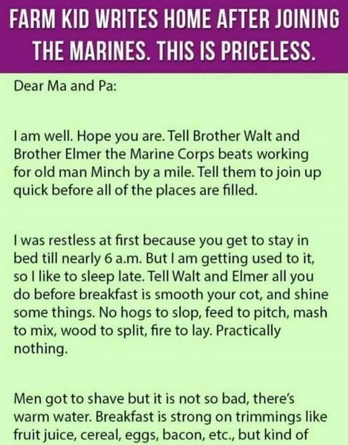A Farm Kid Joins the Marines Dear Ma and Pa, I am well. Hope you are. Tell Brother Walt and Brother Elmer the Marine Corps beats working for old man Minch by a mile. Tell them to join up quick before all of the places are filled. I was restless at first because you get to stay in bed till nearly 5 a.m. But I am getting so I like to sleep late. Tell Walt and Elmer all you do before breakfast is smooth your cot, and shine some things. No hogs to slop, feed to pitch, mash to mix, wood to split, fire to lay. Practically nothing.