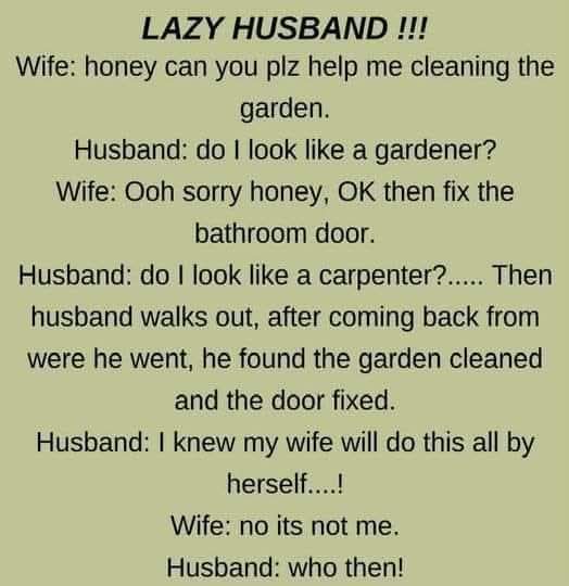 Then husband walks out, after coming back from were he went, he found the garden cleaned and the door fixed.
