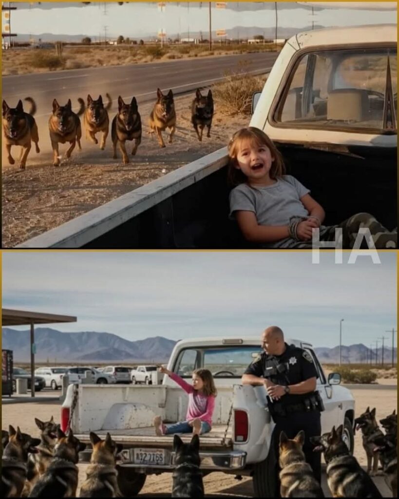 Rex reached the truck with the grace of a coin emitted into water and landed on the tailgate. He pierced the metal with his nails as he planted himself beside the girl. His eyes, those amber wells, locked onto hers like a promise. The rest surrounded them in a close, disciplined ring—shoulder to shoulder, a living barricade. What a stranger would have seen was alarming: teeth, bared, ready—but what Ramón saw was protection. The dogs had understood the world differently and placed themselves between threat and smallness.