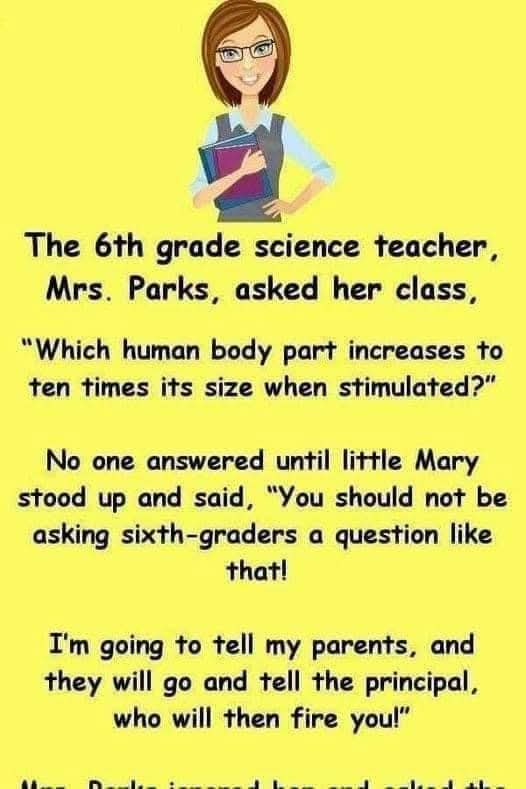 No one answered until little Mary stood up and said, “You should not be asking sixth-graders a question like that! I’m going to tell my parents, and they will go and tell the principal, who will then fire you!”