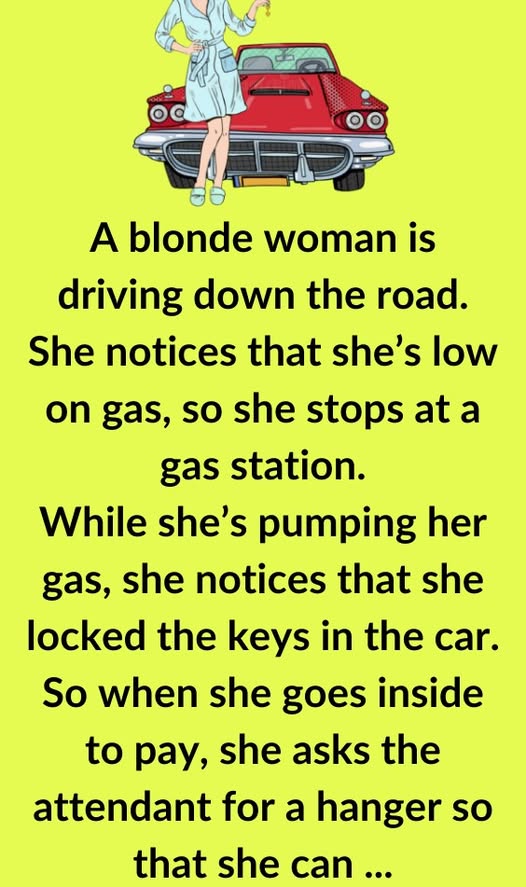 A blonde woman is driving down the road.She notices that she’s low on gas, so she stops at a gas