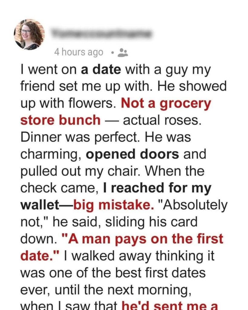 When Eric insisted on paying for our first date, I thought I had met a true gentleman. He arrived with a bouquet of roses, a sweet little gift, and charming conversation that seemed to flow effortlessly. Every romantic comedy cliché was unfolding before my eyes. I could already hear my best friend, Mia, smugly telling me, “I told you so.” She had set this up, after all.