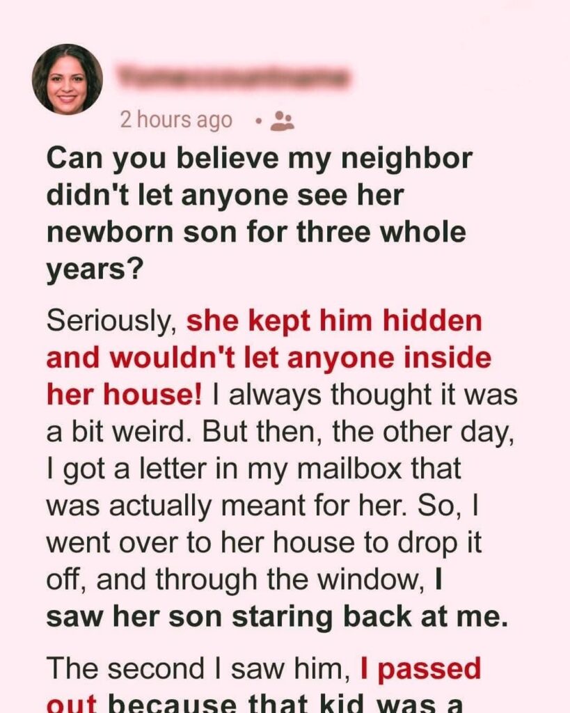 Something always felt off about my neighbor Nelly. In three years, I’d barely seen her outside, except to check the mail or drive to the store. What felt even stranger was that she’d been heavily pregnant when she moved in. Yet, no one had seen her baby even once in these three years.