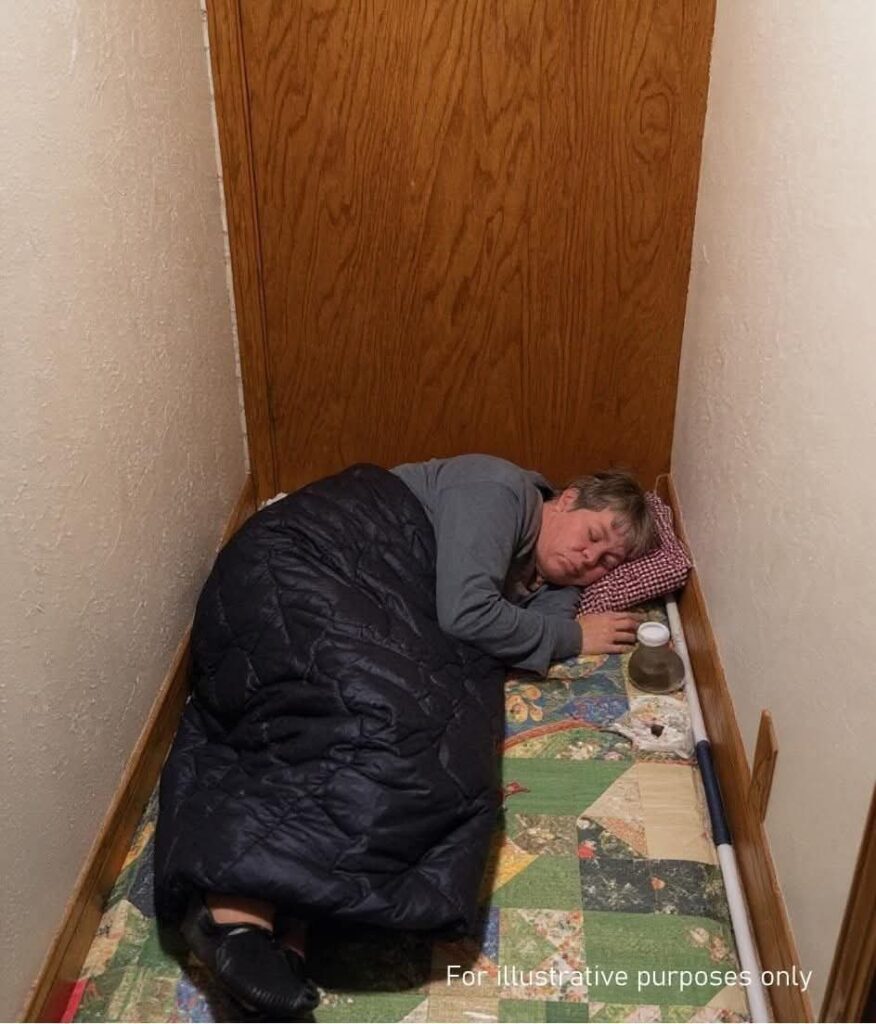 Then I saw it. Behind her, there was a thin camping mat with a scratchy-looking blanket, no pillow, wedged awkwardly between a broom closet and a bathroom door.
