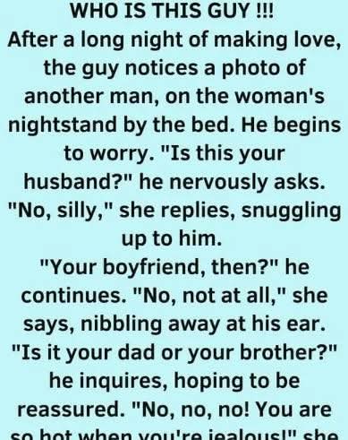 “Your boyfriend, then?” he continues. “No, not at all,” she says, nibbling away at his ear. “Is it your dad