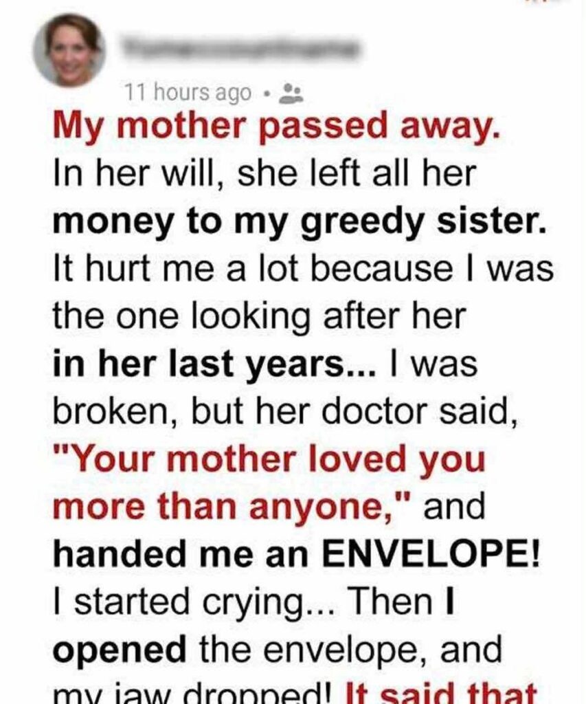 My mother passed away. In her will, she left all her money to my greedy sister. It hurt me a