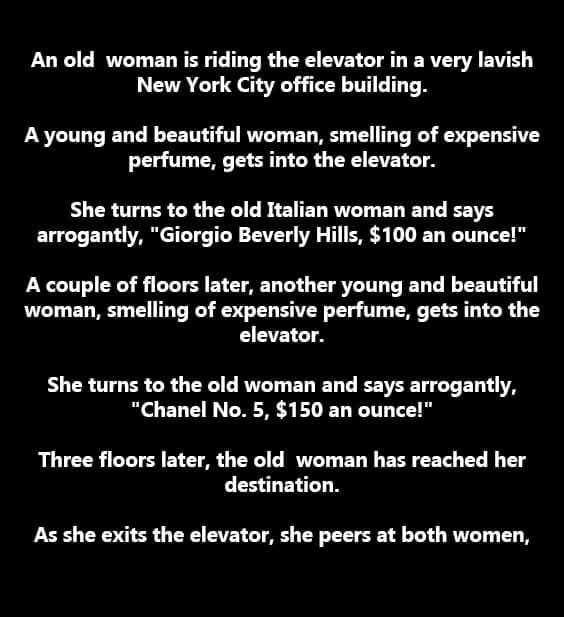 A young and beautiful woman, smelling of expensive perfume, gets into the elevator. She turns to the old Italian woman
