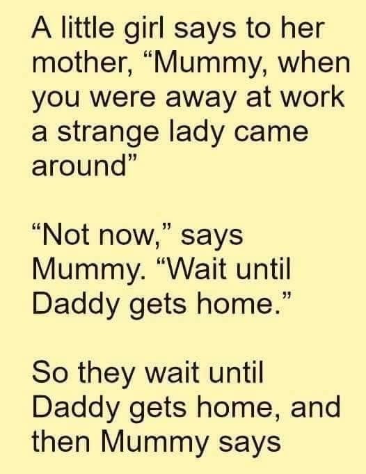 A little girl says to her mother: “Mummy, when you were away at work a strange lady came around”… “Not