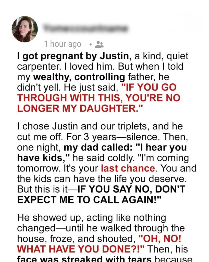 I got pregnant by Justin, a kind, quiet carpenter. I loved him. But when I told my wealthy, controlling father, […]