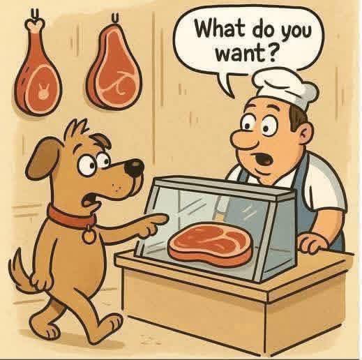 A Dog Walks Into A Butcher Shop. The butcher asks, “What do you want?” The dog points to steak in