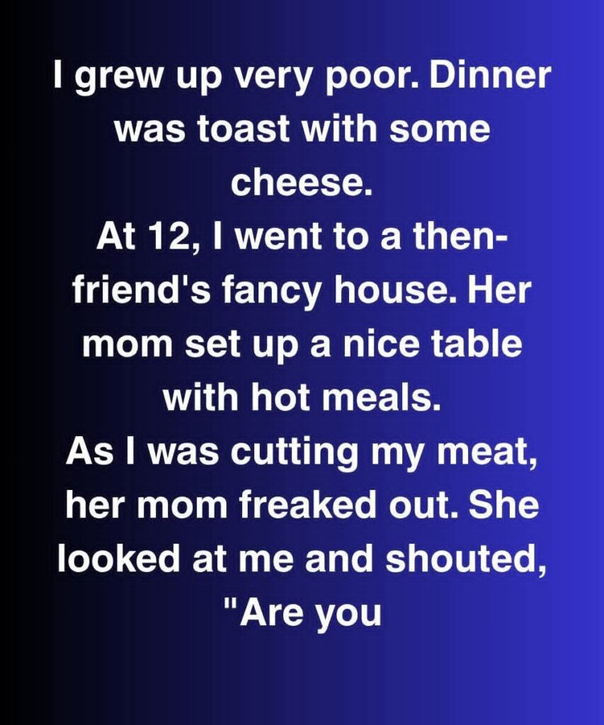 I grew up very poor. Dinner was toast with some cheese. At 12, I went to a then-friend’s fancy house.