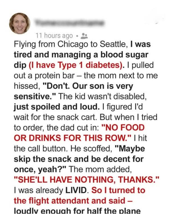 Never in my life did I think I’d have to fight for my right to eat a protein bar on a plane. But when faced with entitled parents who valued their son’s tantrum-free flight over my health, I refused to back down. What happened next left the entire row speechless.