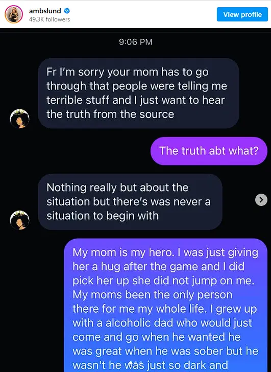 “My mom is my hero. I was just giving her a hug after the game, and I did pick her up. She did not jump on me. My mom’s been the only person there for me my whole life. I grew up with an alcoholic dad who would just come and go when he wanted. He was great when he was sober, but when he wasn’t, he was just so dark and different.”