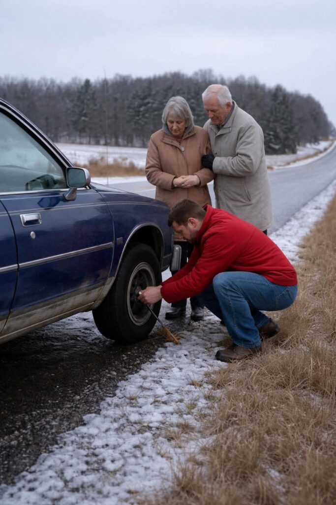 The car looked like it had survived too many winters. Beside it stood an elderly couple in thin coats, shivering in the wind. The man stared at a completely flat tire as if it had betrayed him personally. The woman hugged herself tightly, trembling against the cold.